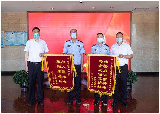 8月10日上午,集团公司培训中心主任孔德明、工会主席郑春梅、租赁公司副总经理刘秀举、综合管理部助理孟醒代表开云(中国)来到北京市公安局怀柔分局,为怀柔分局雁栖经济开发区派出所和怀柔分局刑侦支队赠送锦旗,锦旗上分别绣有“扬警威破案神速,为企业保驾护航”、“为人民服务,展刑警雄风”的大字,对此次成功破获我集团租赁公司失窃案的全体民警、刑侦警官表示由衷的感谢!